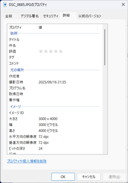 画像を右クリック → 「プロパティ」 → 「詳細」タブ → 「プロパティと個人情報を削除」