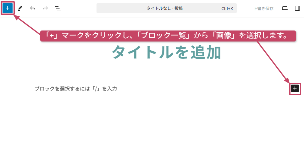 - 画面左上または入力エリア右の「+(ブロック追加)」クリックし、「画像」を選択します。