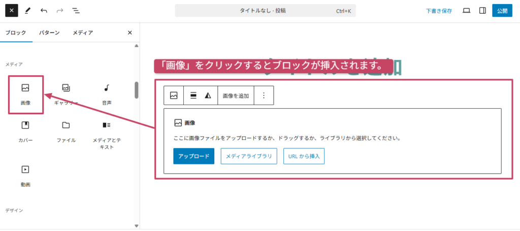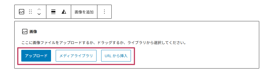 画像ブロックで画像を追加するには、「アップロード」「メディアライブラリ」「URLから挿入」 の3通りがあります。