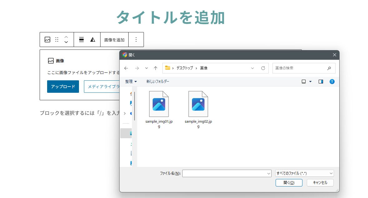 「アップロード」からパソコン内の画像ファイルを選択し、挿入したい画像を指定して追加します。