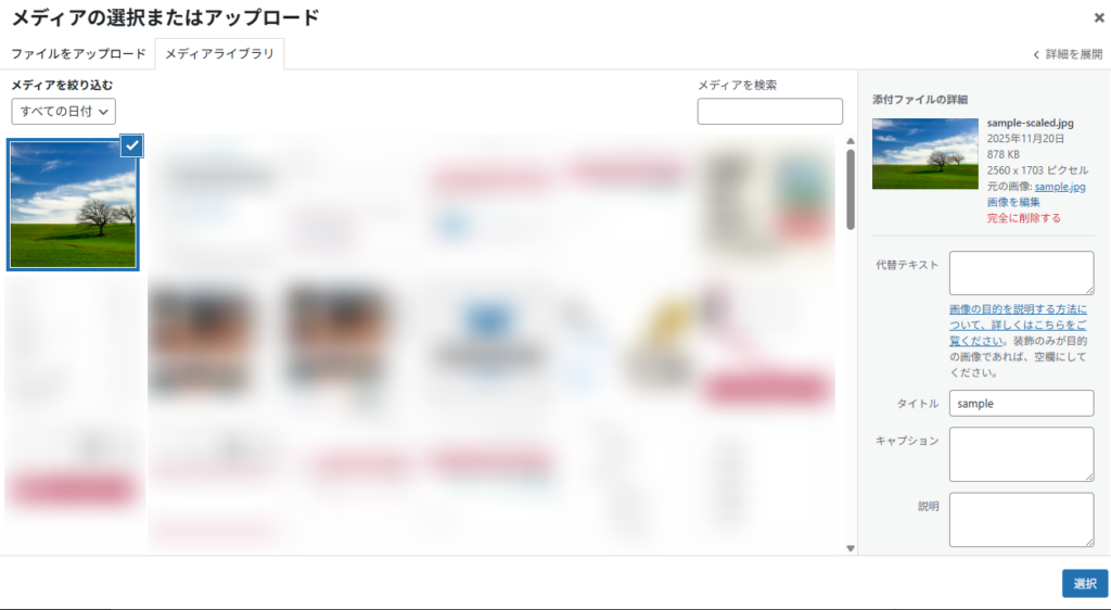 「メディアライブラリ」からアップロード済みの画像を指定して選択をクリックすると追加されます。